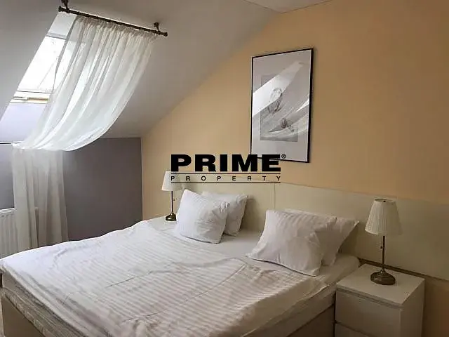 Zařízený, 2 ložnicový, klimatizovaný půdní byt s 1 koupelnou k pronájmu, 3+1, 92m2, s terasou 8m2 s výhledem do zeleného vnitrobloku, situovaný v 5. patře nově kompletně zrekonstruovaného bytového domu s výtahem.