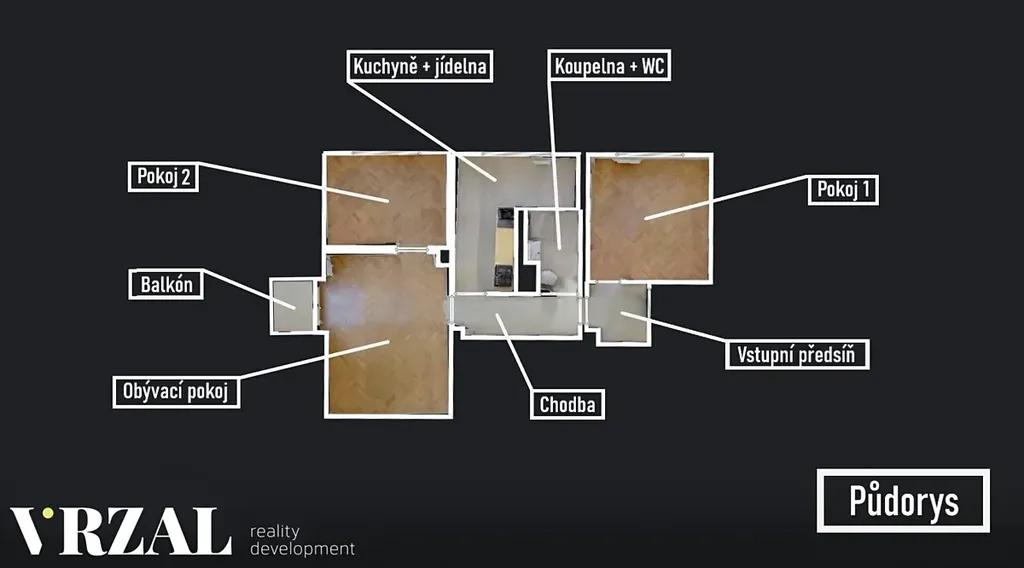 Byt se skládá z prostorného obývacího pokoje s přístupem na balkón s hezkým výhledem, ložnice, dětského pokoje, prostorné chodby s předsíní, kuchyně s vybavenou kuchyňskou linkou a koupelny se sprchovým koutem a toaletou - PŮDORYS BYTU V NABÍDCE