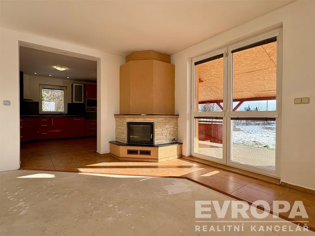 • Společenská zóna: Srdcem domu je prosluněný obývací pokoj (22 m²) s krbem a přímým vstupem na terasu, která v létě přirozeně rozšiřuje vnitřní prostor. Na obývací pokoj plynule navazuje kuchyně s jídelnou (12,6 m²).