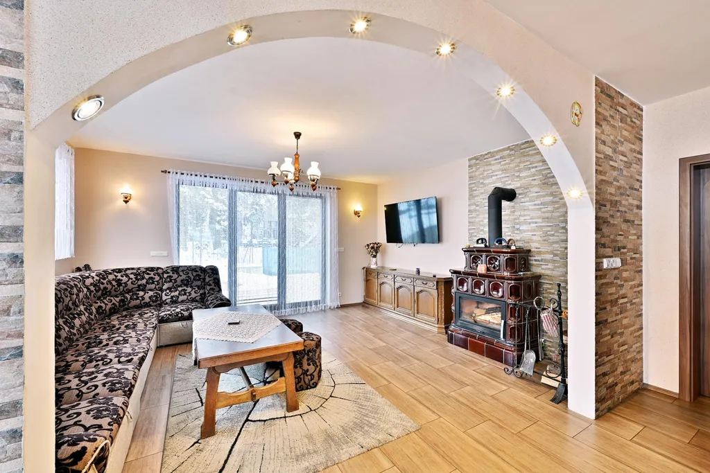Dominantou domu je reprezentativní obývací prostor s designovými kachlovými kamny značky ABX, která plní nejen estetickou, ale i funkční roli. Obývací pokoj je plynule propojen s kuchyní a tvoří přirozené centrum domu pro rodinný i společenský život.