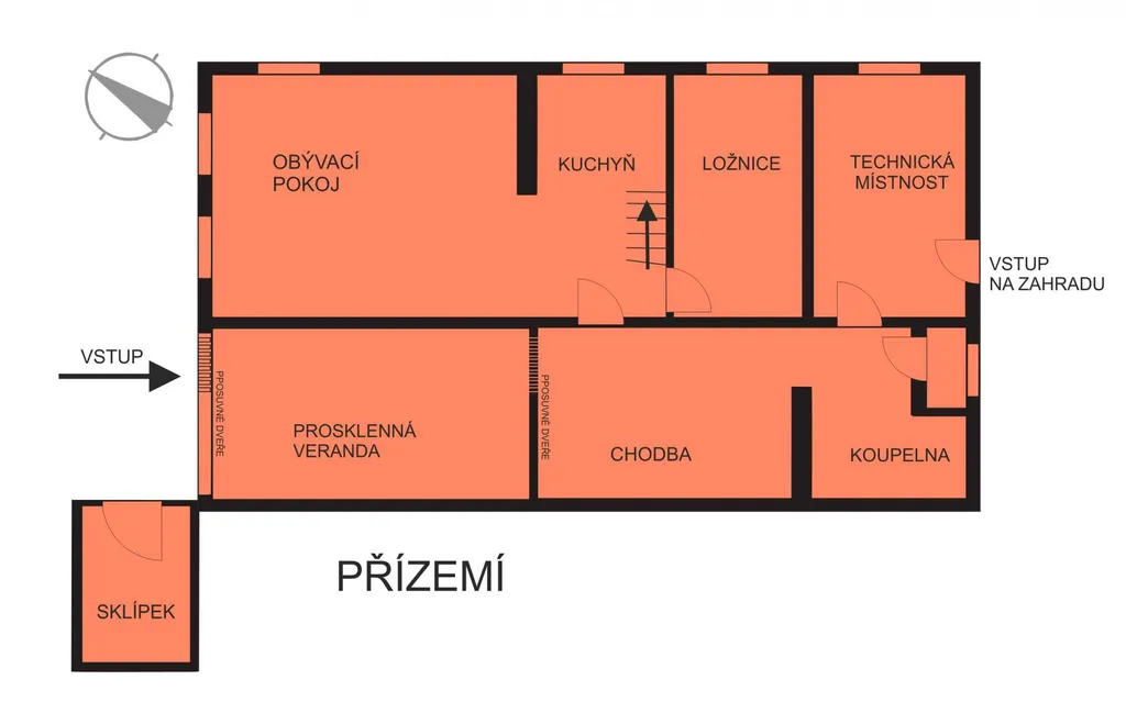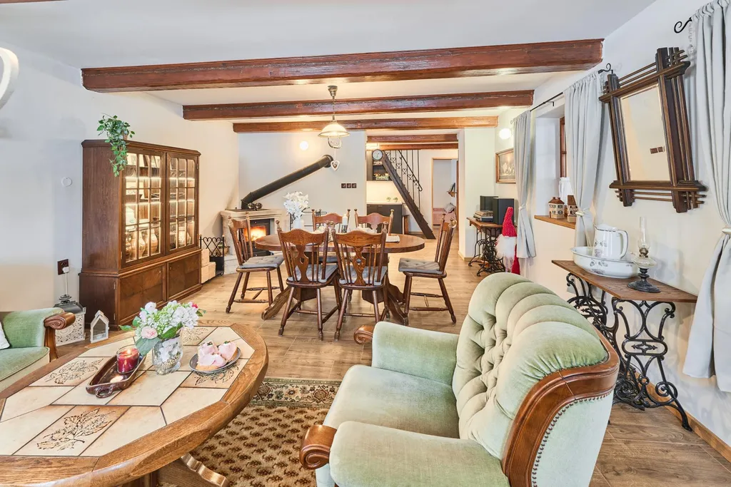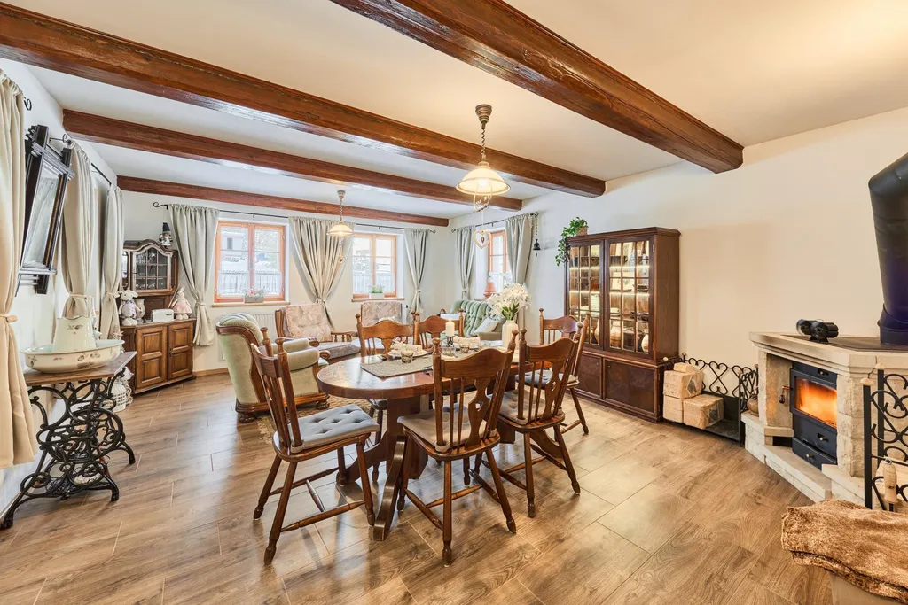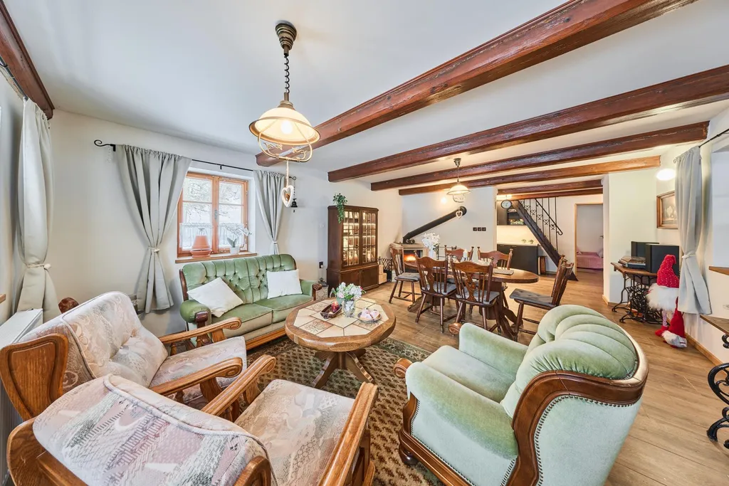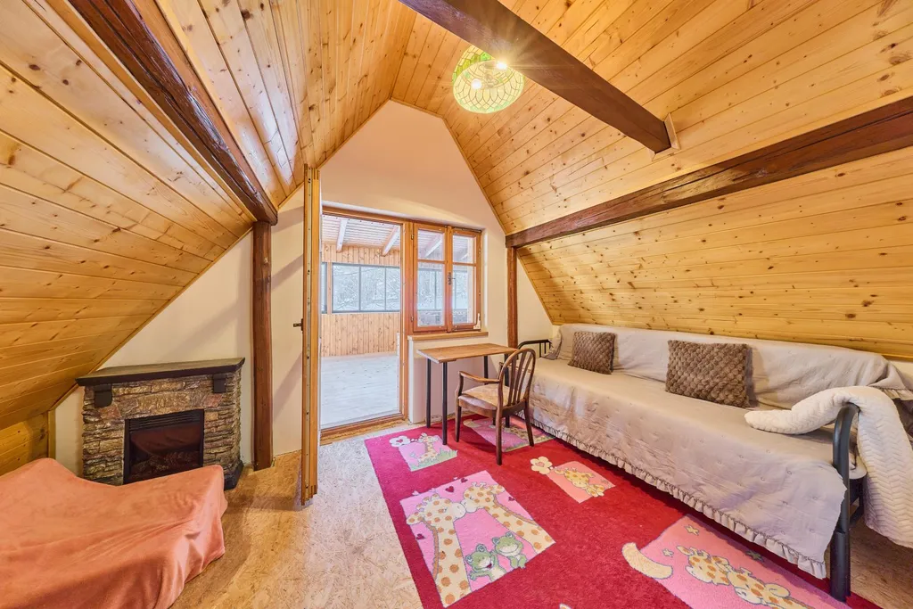 Dispozice chalupy: prosklená prostorná veranda, kam svítí přes den slunce a můžete se ohřívat po koupeli ve vířivce, která zde má své místo, dále vstupní hala s příjemným posezením odkud vcházíte do obytné místnosti propojené s kuchyní, a kde jsou umístěna krbová kamna s rozvodem do celého objektu. Uvítáte s nadšením moderní kuchyňskou linku se zajímavě propojenými krbovými kamny na vaření. Z kuchyně vejdete do ložnice. Z haly vcházíte do koupelny se sprchovým koutem, je zde samostatné WC, další místnost může být označena jako technická místnost, kde jsou litinová kamna pro ohřev v zadní části chalupy a elektrický bojler, úložiště pro sekačku atd.