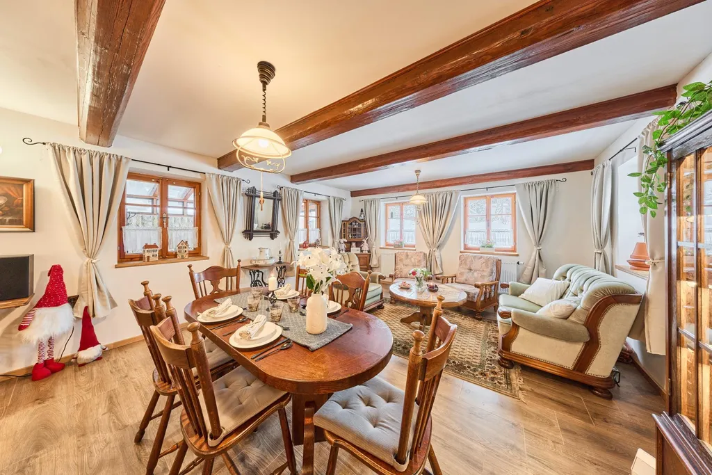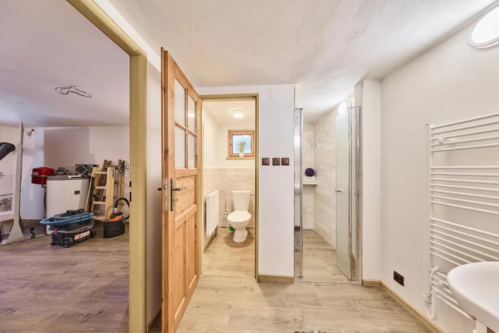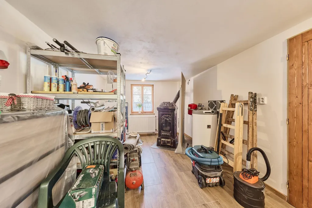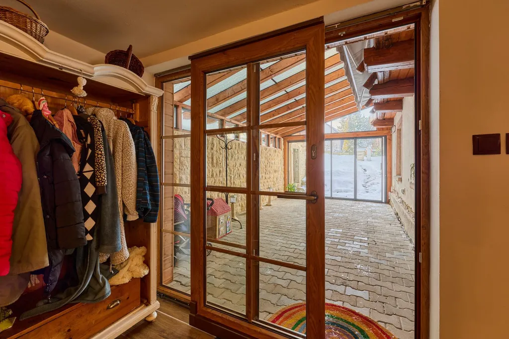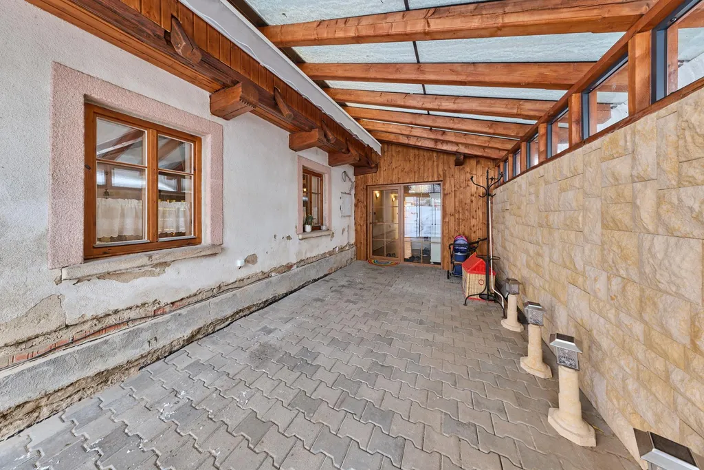 V letních měsících je nejvíce využívána prosklená veranda. Hospodyňka využívá také klípek umístěný u vstupu do chalupy. Užitná plocha přízemí domu činí: 140 m2, z toho světnice 30,4 m2, kuchyně 12 m2, ložnice 12 m2, koupelna s toaletou 6 m2, technická místnost 14 m2, chodba 17,5 m2, prosklená veranda 41 m2, sklípek 5,6 m2, dále půdní prostory skýtají další možnosti využití na ploše více než 90 m2, zahrada kolem chalupy směrem k potůčku má 613 m2. PENB nedodán, proto uvádíme třídu G.