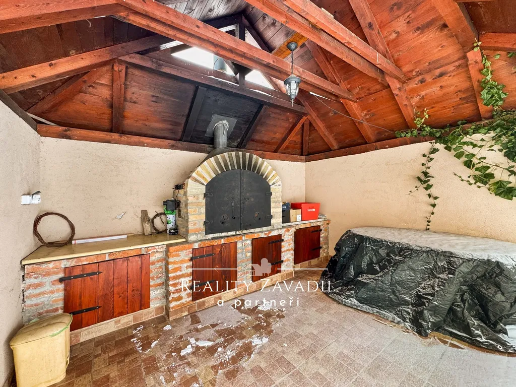 Exteriér nabízí upravenou a udržovanou zahradu s altánem, krbem a posezením pro příjemné letní večery. K dispozici je parkování pro pět automobilů a dostatek prostoru pro relaxaci, zahradní aktivity nebo další rozvoj dle představ nového majitele.