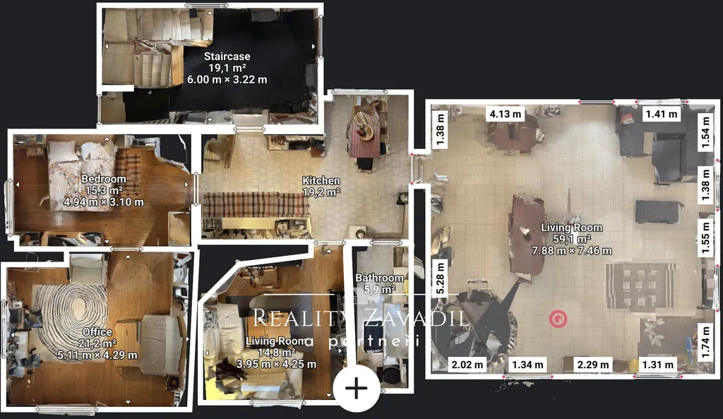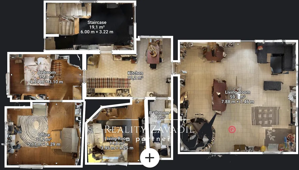 Dům disponuje zastavěnou plochou přibližně 200 m² a užitnou plochou kolem 320 m², vše na pozemku o rozloze 1 244 m². V přízemí se nachází prostorná kuchyně se samostatnou jídelnou, velký obývací pokoj s krbem, který vytváří útulnou atmosféru, pracovna, koupelna a vstupní chodba. Dominantou přízemí je společenská místnost o velikosti 72 m², která je ideální pro pořádání oslav, firemních akcí nebo setkání s hosty.