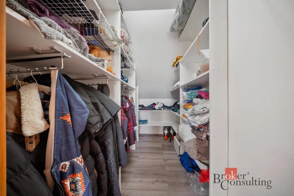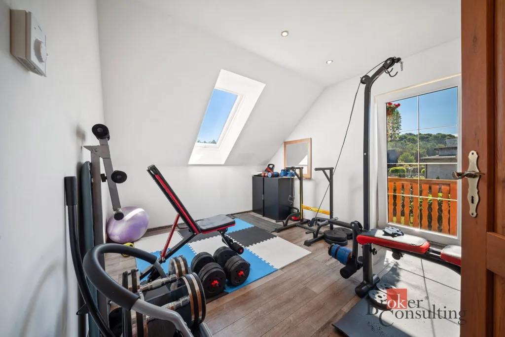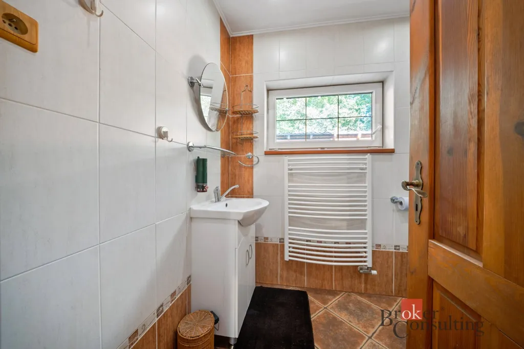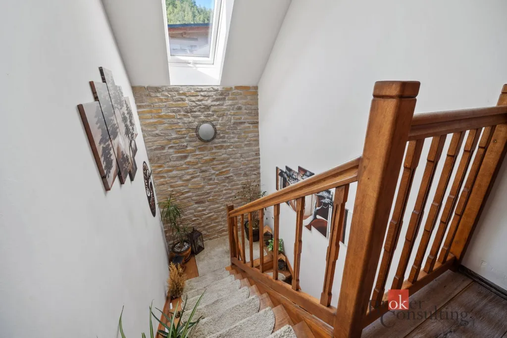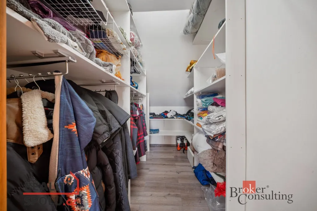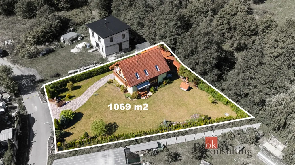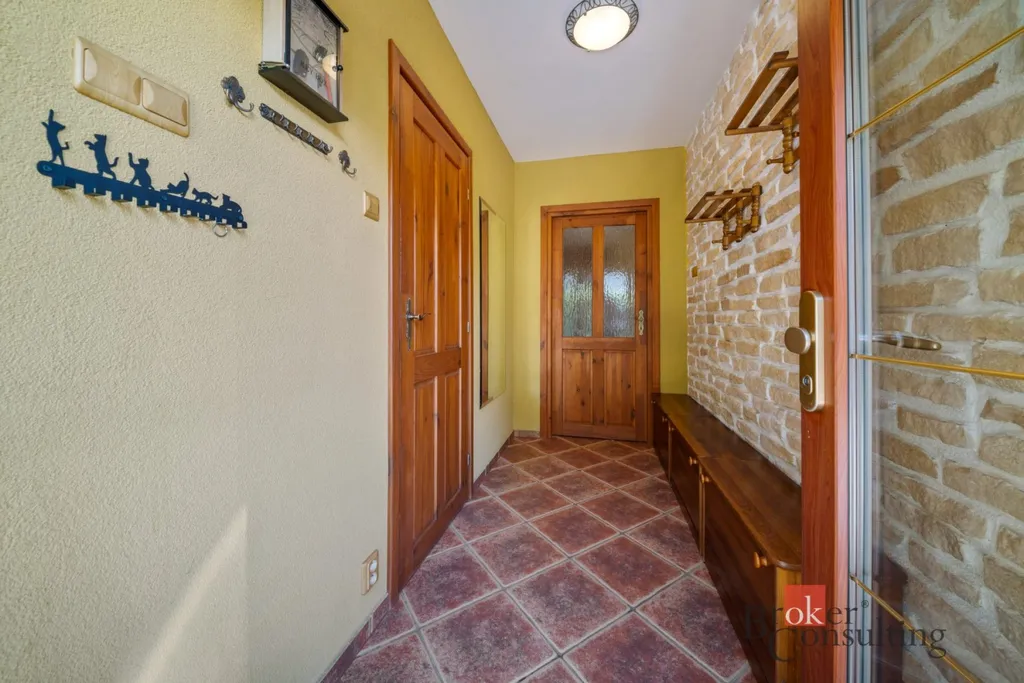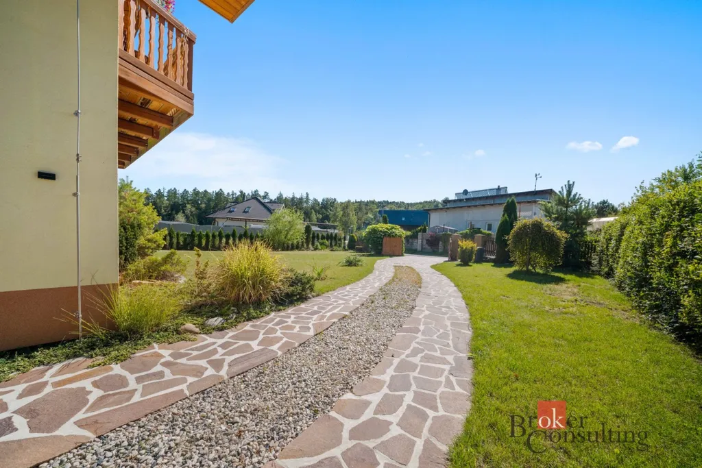 Dispozice domu 5+kk nabízí vstupní chodbu, světlý obývací pokoj s krbem a přímým vstupem na terasu, čtyři ložnice, jedna koupelna v přízemí se sprchovým koutem, druhá koupelna ve druhém patře s prostornou vanou, šatna, sklad, spíž a technická místnost.