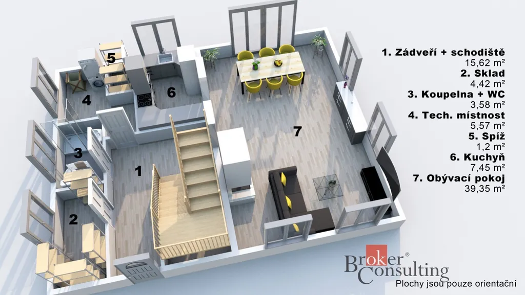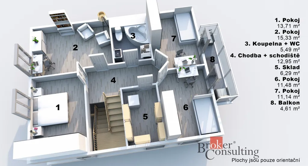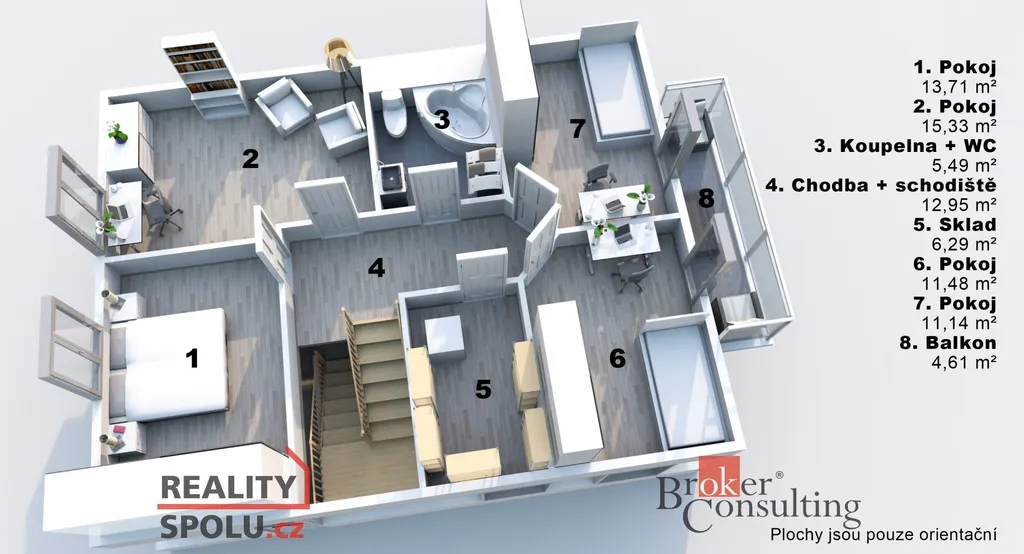 Uvedené výměry jsou orientační. Veškeré zveřejněné údaje mají pouze informativní charakter a nepředstavují nabídku ve smyslu § 1731 nebo § 1732 občanského zákoníku, ani veřejný příslib dle § 1733 občanského zákoníku.