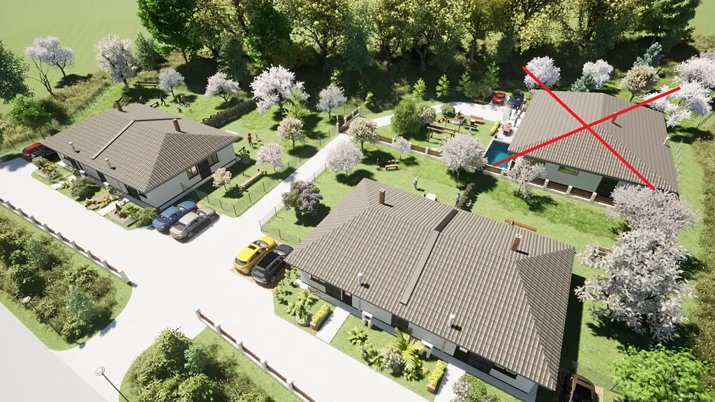 Parcely jsou umístěny v lokalitě, která byla projektována jako rezidenční bydlení, které zahrnuje 3 parcely na kterých jsou umístěny dva přízemní dvojdomky a jeden samostatný přízemní RD. Vjezd z hlavní silnice na parcely lze uzavřít branou a všechny parcely tak společně oddělit, čímž je docíleno uzavřené rezidenční lokality.