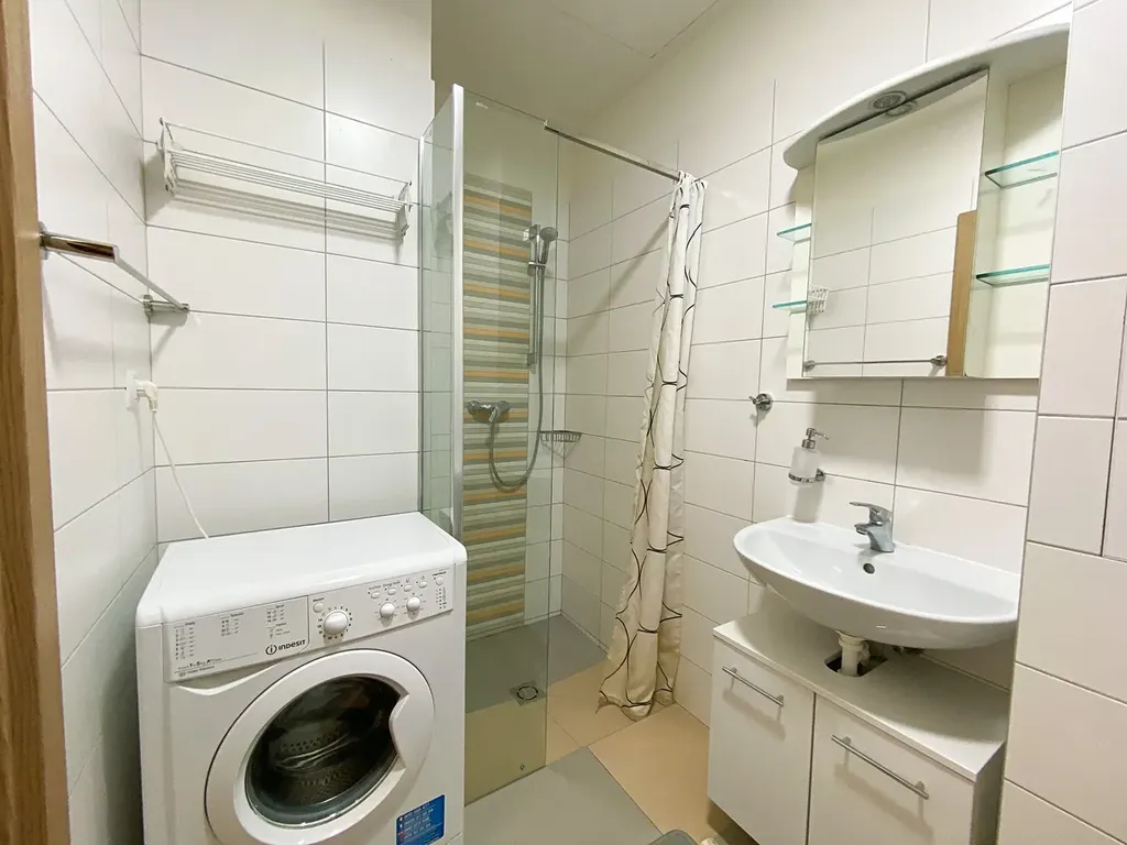 V koupelně se nachází sprchový kout a pračka.