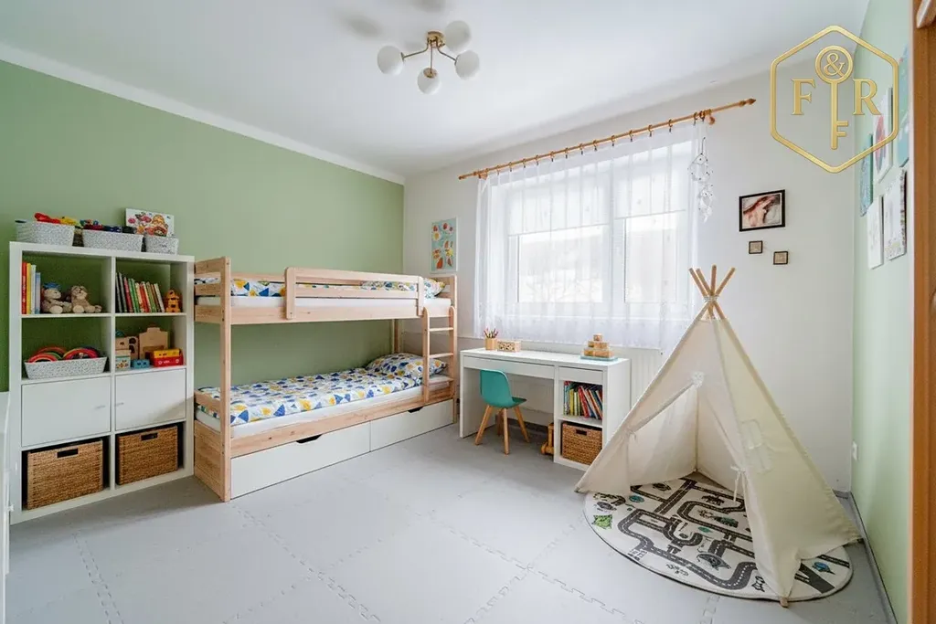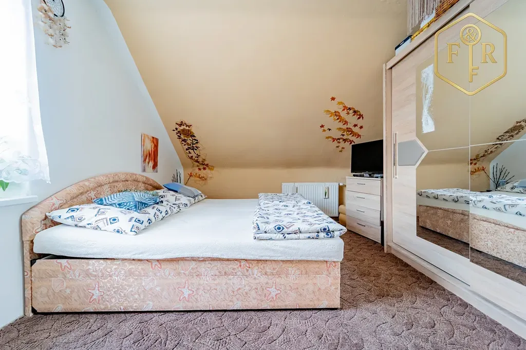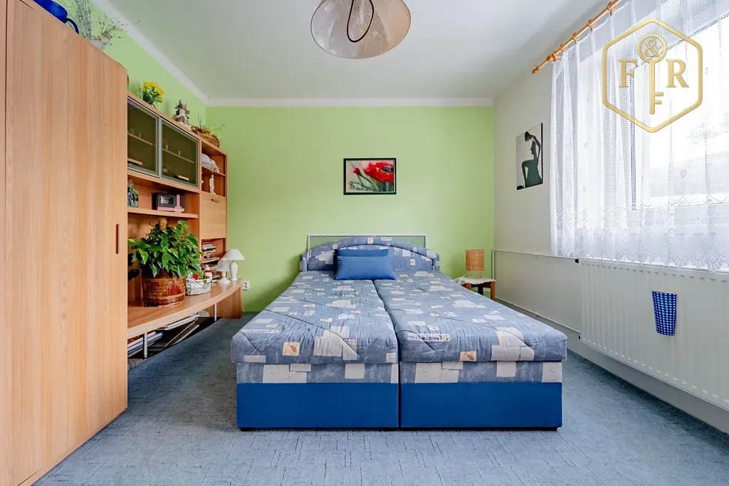 Dispozice domu je 5+kk (PP: sklady, kotelna; 1.NP: 2 pokoje, kuchyně, koupelna, WC; Podkroví: 3 pokoje, kuchyňský kout, balkon, WC)