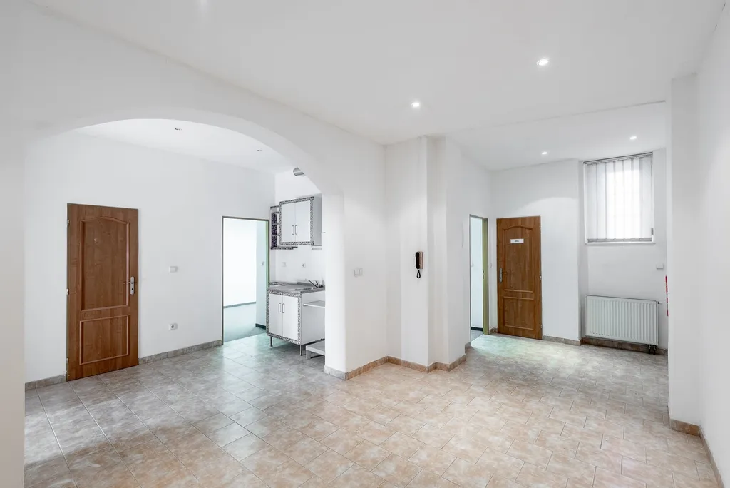 Prostor je rozdělen na 3 samostatné neprůchozí místnosti, velkou vstupní halu s kuchyňkou, koupelnu se sprchou a toaletou a samostatné WC.