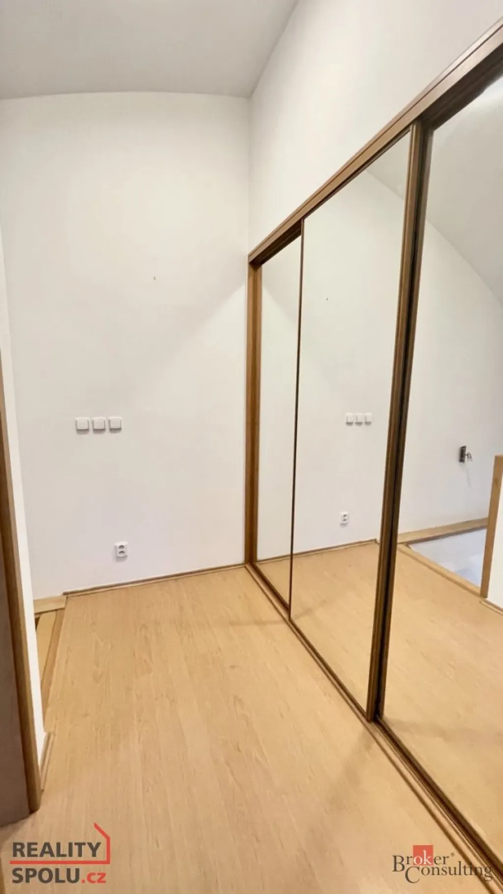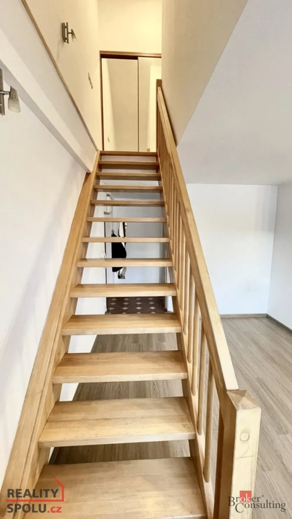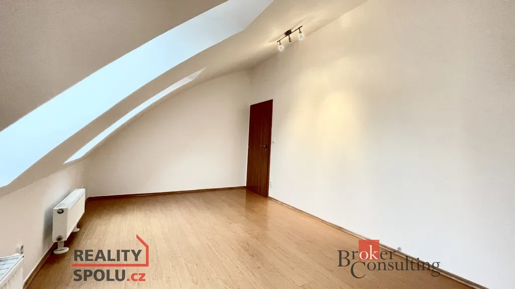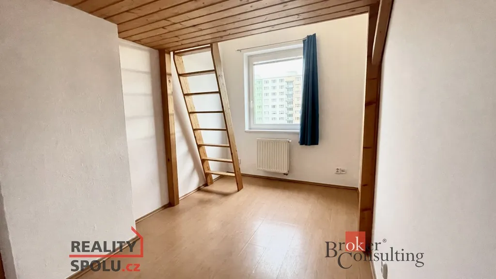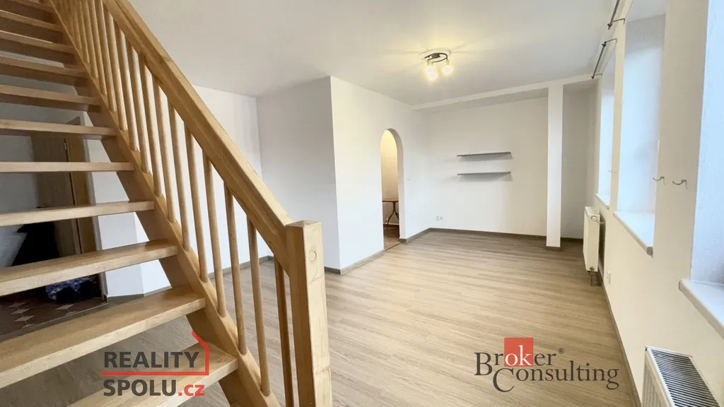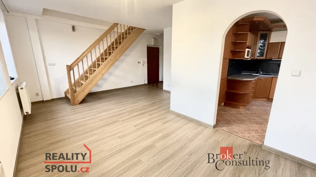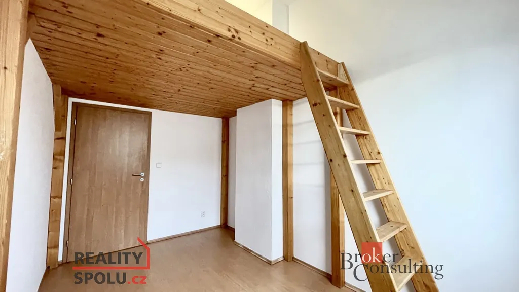 Byt je členěn na zádveří, ze kterého se vstupuje do koupelny a do obývacího pokoje s kuchyňským koutem. Z obývacího pokoje vedou schody do patra, kde nalezneme velkou šatní skříň a dva samostatné pokoje. Součástí jednoho z pokojů je praktické vyvýšené spaní s novými matracemi.