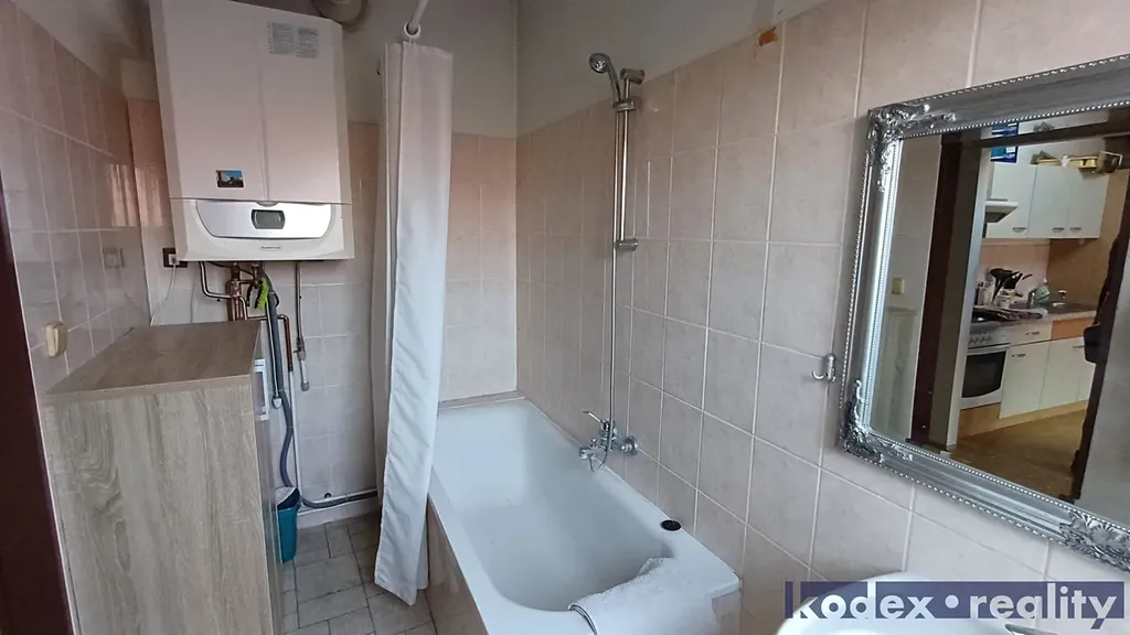 Dispozice: prostorná vstupní chodba, koupelna, samostatné WC, ložnice + hlavní obytná místnost s kuchyňským koutem. Byt je po rekonstrukci – zánovní kuchyňská linka se sporákem, nové WC, nová koupelna se sprchovým koutem, plynový kotel s bojlerem, mikrovlnná trouba, klimatizační jednotka, zanechané přiznané trámové prvky. Sítě: elektřina, ohřev vody a vytápění plynový kotel lokální, plyn.