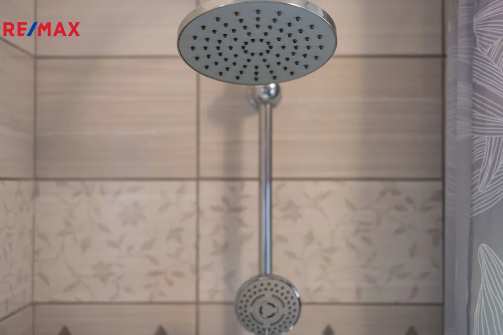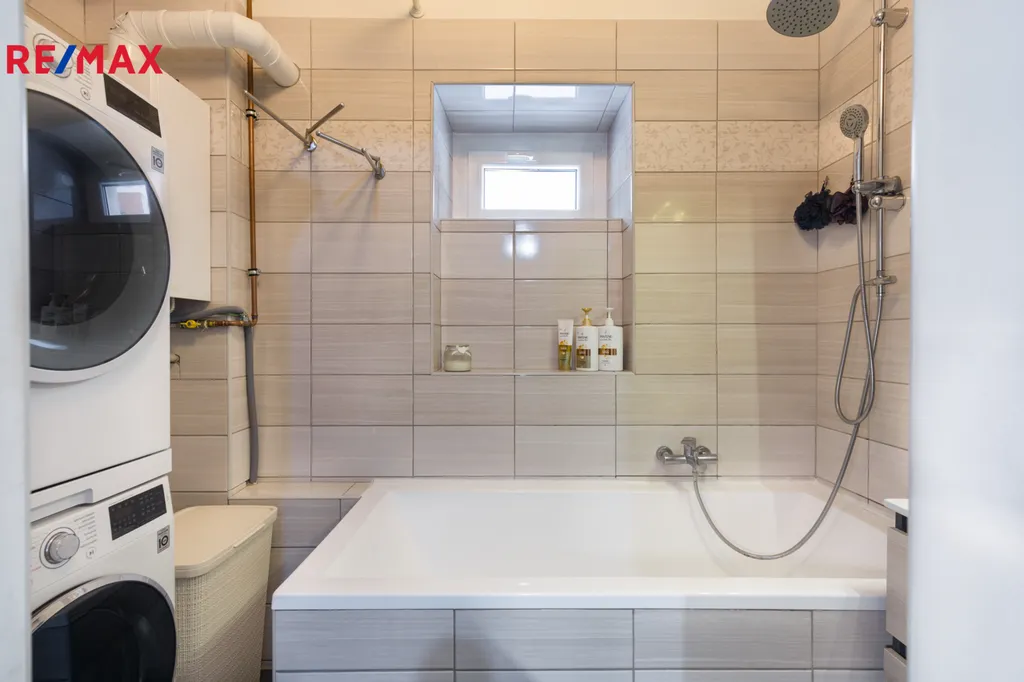 ✅ Koupelna s oknem, s obkladem v béžové barvě, je vybavena podélnou vanou, umývadlovou skříňkou, plynovým kondenzačním kotlem