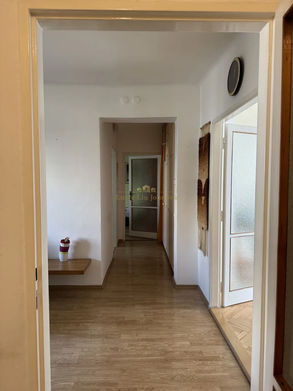 Vybavení bytu: kuchyňská linka s plynovým sporákem a elektrickou troubou, lednice, digestoř, pračka v koupelně, stůl se židlemi v jídelně, obývací prostor je rovněž v základu vybaven. V ložnicích jsou postele, psací stůl a rovněž i knihovna. Byt bude volný v březnu, jedná se o dlouhodobý pronájem.