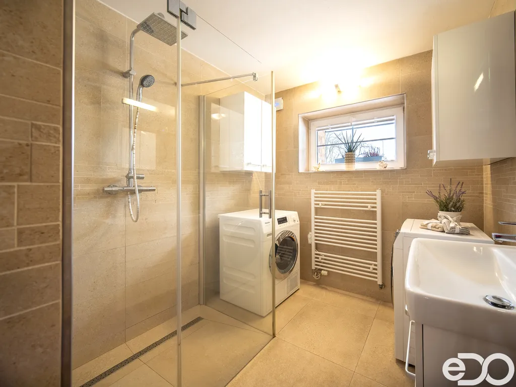Z verandy dále mohu pokračovat na toaletu s plynovým kotlem, do koupelny se sprchovým koutem a prostorem pro pračku a sušičku. Dále se dostávám do plně vybavené kuchyně na míru opět v nadstandardním provedení s jídelním stolem a navazujícího velkého obývacího pokoje.