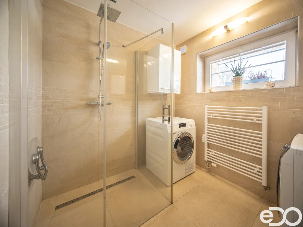 Vchod do domu je skrz garáž a dále terasou až do velké předsíně ve verandě. To oceníte zejména v deštivých a zimních dnech. Z předsíně mohu pokračovat do suterénu s dílnou a špajzem - je zde také přípojka vody a změkčovač vody. To je obrovský benefit pro celou domácnost a to nejen z pohledu údržby a čištění skel ve sprchovém koutě, ale také prodloužení životnosti spotřebičů jako je pračka, kávovar, myčka atd.