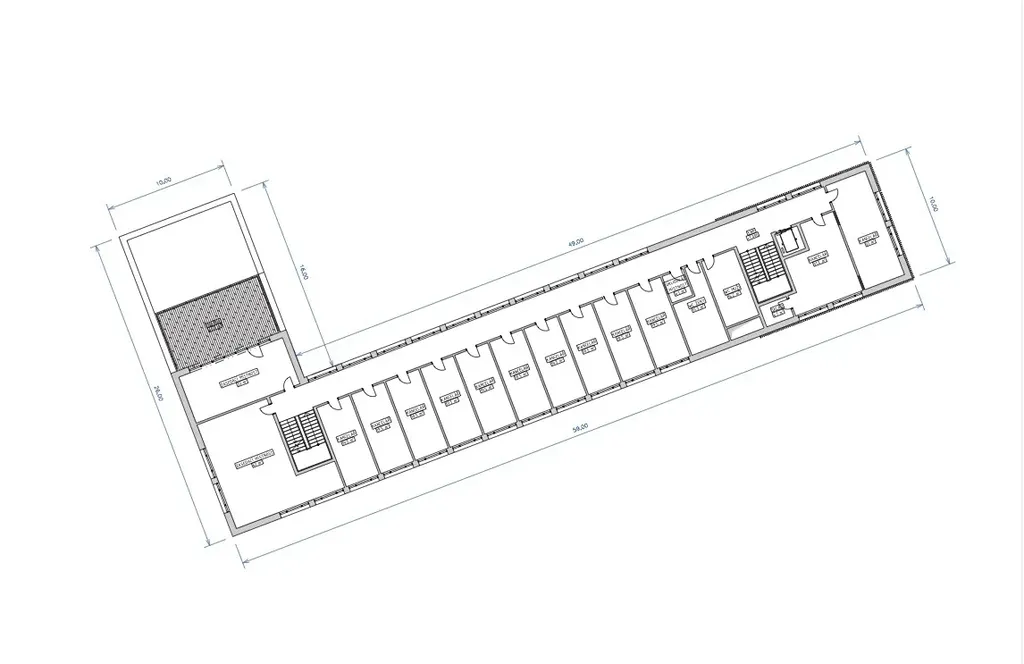 Dispoziční řešení je navrženo s ohledem na funkční provoz, bezbariérový přístup a jasné oddělení pohybu pacientů a personálu. V přízemí se nachází vstupní lobby s recepcí, čekárnami, toaletami a základním zázemím. Vyšší podlaží jsou určena pro odborné ordinace, vyšetřovny a administrativní prostory. Studie umožňuje flexibilní přístup podle zvoleného scénáře výstavby – varianta A počítá se dvěma nadzemními podlažími a hrubou podlažní plochou cca 1 348 m², varianta B se třemi nadzemními podlažími a plochou přibližně 2 086 m².