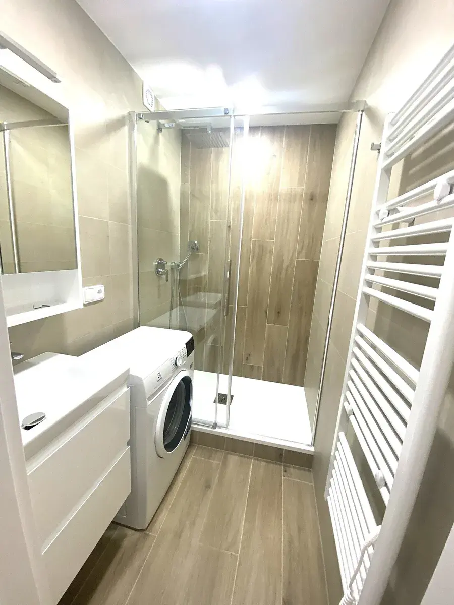 V moderní koupelně se sprchovým koutem je pračka. V chodbě velká skříň.