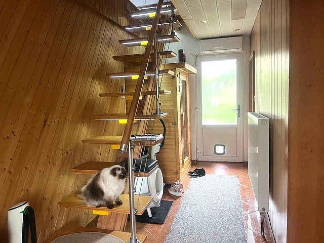 V přízemí se nachází 2+kk – předsíň, kuchyň, jídelna, obývací pokoj s krbem, ložnice, koupelna a WC.
