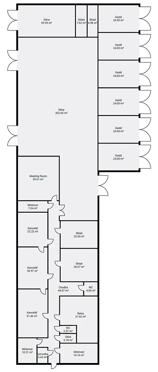Prostorné dílny v objektu nabízejí široké možnosti komerčního využití, ať už jde o výrobu, skladování či jiné obchodní činnosti. Nechybí zde sociální zázemí pro zaměstnance a administrativní zázemí v počtu 4 kanceláří o výměrách (39, 22, 27, 31 m2).