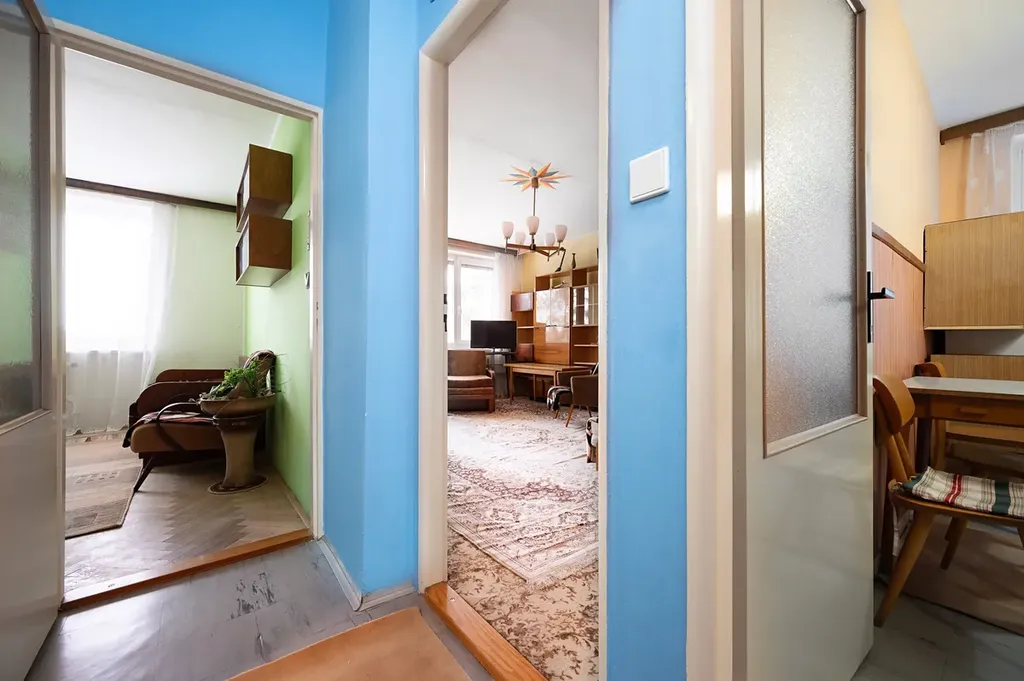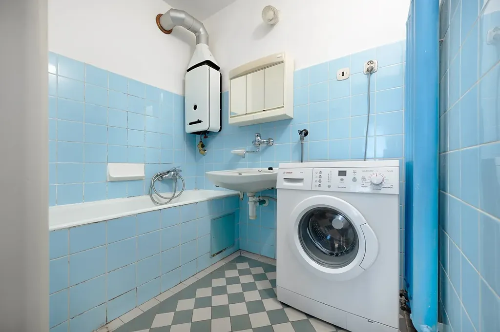 Dispozice bytu je velmi praktická – oba pokoje jsou neprůchozí, kuchyně samostatná, koupelna a toaleta oddělené. Součástí bytu je také komora či spíž, která nabízí další úložný prostor. K bytu náleží sklep v suterénu domu, kde nalezneme také kočárkárnu či kolárnu.