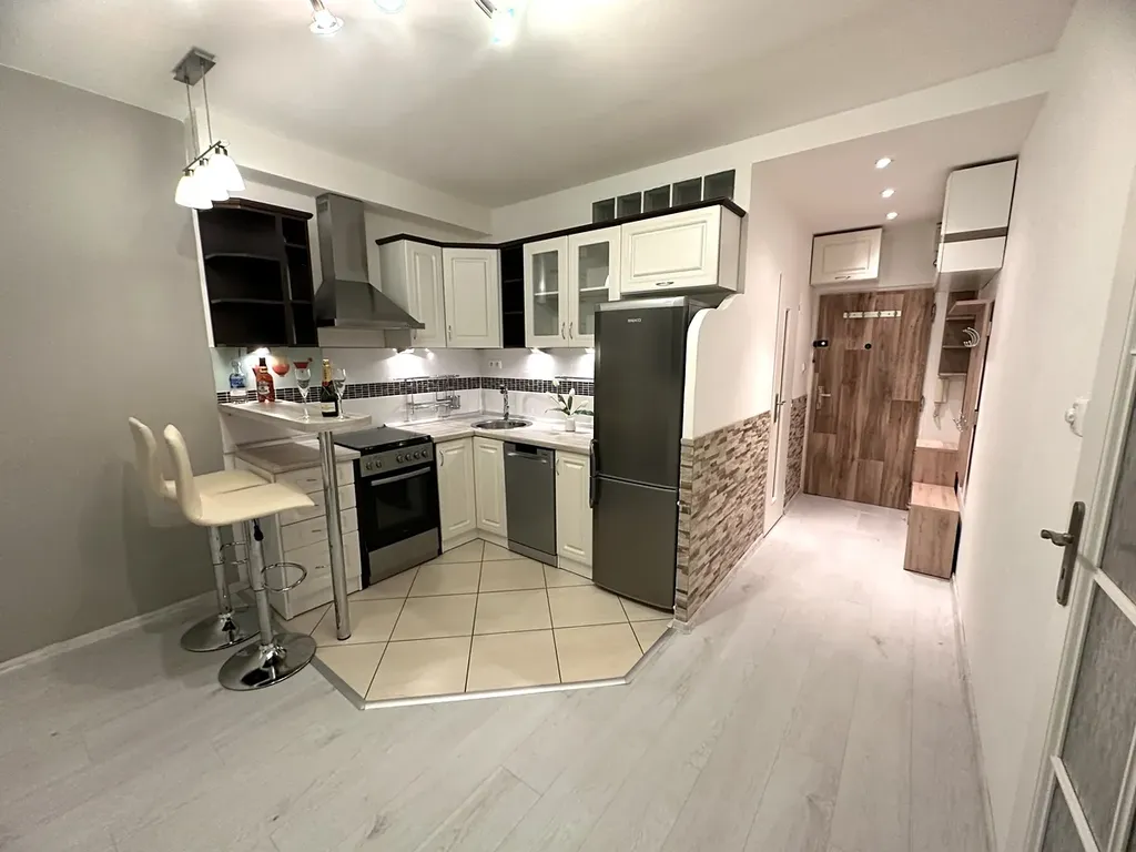 moderní kuchyňskou linku se spotřebiči (myčka, lednice) a barový pult – perfektní pro ranní kávu i večerní sklenku,