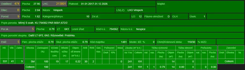 - p.č. 669/1 vedená jako lesní pozemek o celkové výměře 15 283 m2, z toho vlastníme podíl 1/2 tedy 7 642 m2 (stáří lesa 137 let - zastoupení dřevin smrk, modřín, stáří lesa 34 a 50 let - zastoupení dřevin smrk, stáří lesa 26 let - jeřáb, smrk, stáří lesa 17 let - jeřáb, bříza, keře, smrk),
