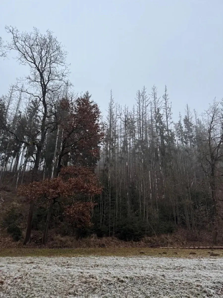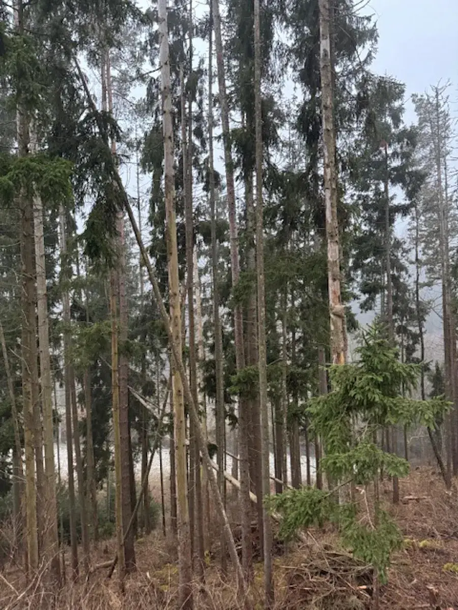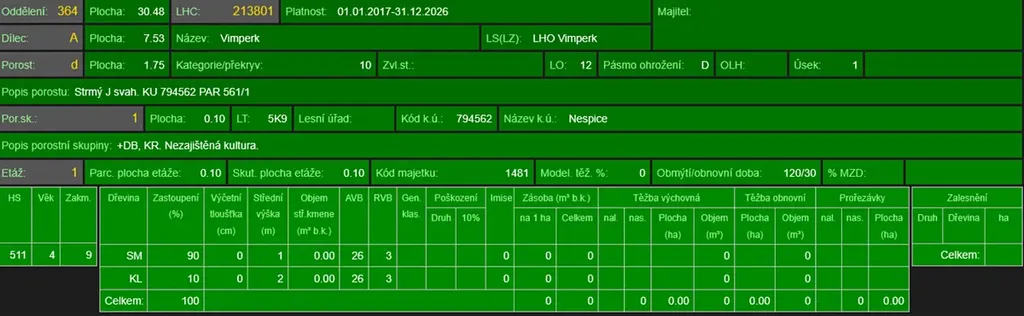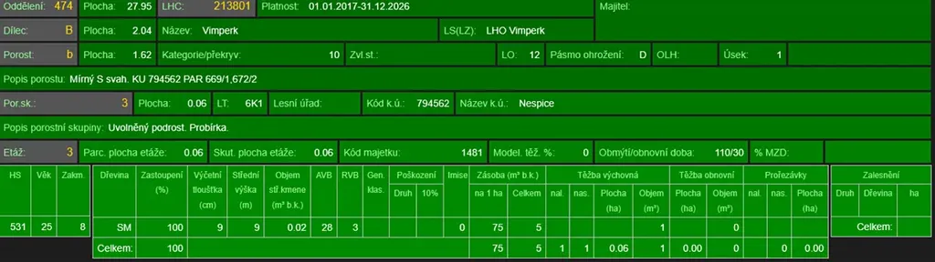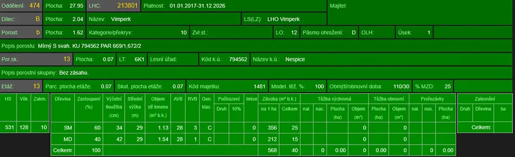 - p.č. 561/1 vedená jako lesní pozemek o celkové výměře 17 496 m2, z toho vlastníme podíl 1/2 tedy 8 748 m2 (stáří lesa 101 let - zastoupení dřevin smrk, modřín, borovice, bříza, stáří lesa 13 let - zastoupení dřevin smrk, javor),