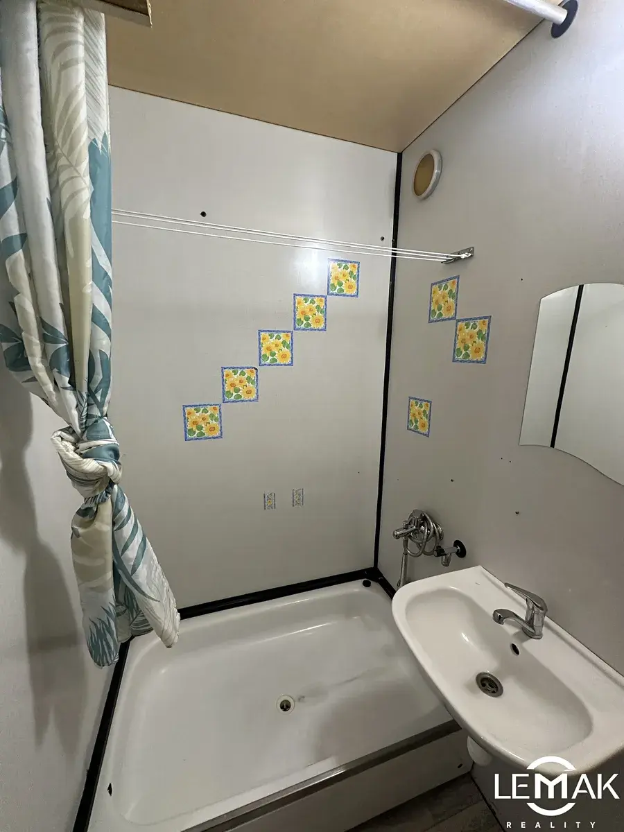 Byt se skládá z předsíně, která po levé straně plynule navazuje na samostatnou šatnu. Na pravé straně se nachází koupelna s vanou a WC. Dominantou bytu je velkoryse řešený obývací pokoj, který je průchozí – z něj je vstup do samostatné kuchyně i do ložnice. Kuchyňská linka prošla modernizací a spotřebiče zobrazené na fotografiích jsou součástí nájmu.