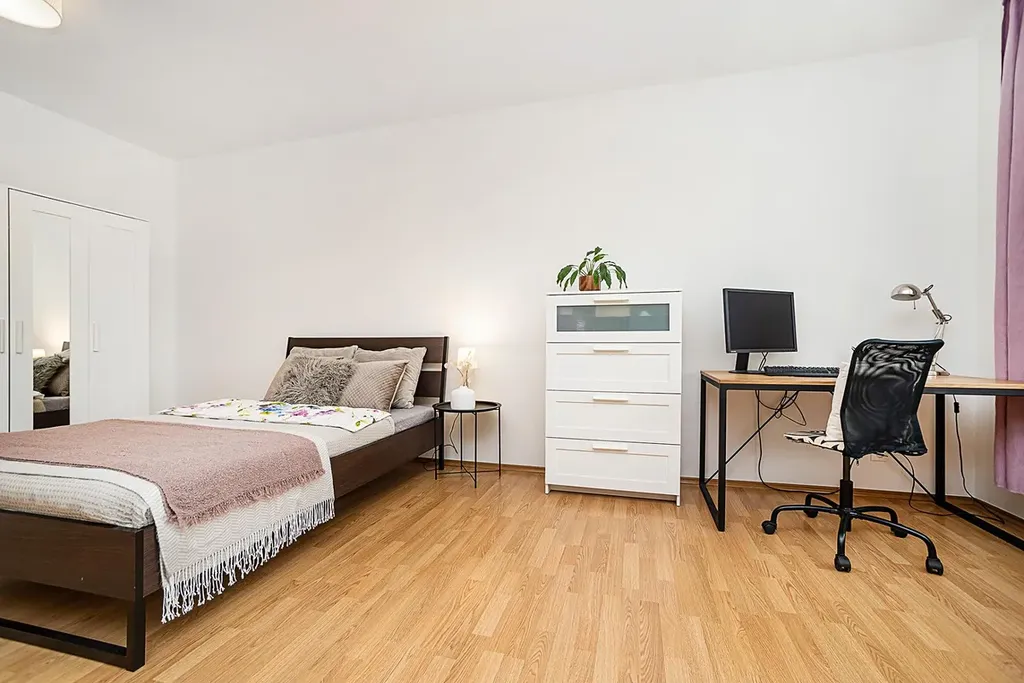 Byt nabízí prostorný obývací pokoj s kuchyňským koutem vybaveným spotřebiči (lednice s mrazákem, elektrická trouba, varná deska, digestoř, myčka nádobí), samostatnou ložnici, koupelnu s vanou a toaletou, předsíň, komoru a balkon. Pronajímá se částečně zařízený - k dispozici jsou 2 barové židle, pračka a Wi-Fi router.