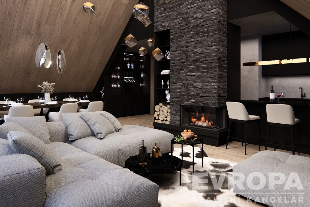 Dispozičně jednotka nabízí prostorný obývací pokoj s vysokými stropy, tři samostatné ložnice, tři koupelny s toaletami, šatnu a samostatnou saunu s jedinečným výhledem na sjezdovky. Z obývacího prostoru se otevírá dechberoucí panorama Krkonoš, které podtrhuje výjimečný charakter této nemovitosti. Dominantou obývacího pokoje bude klasický krb, jenž dotváří příjemnou horskou atmosféru a pocit útulného luxusu.