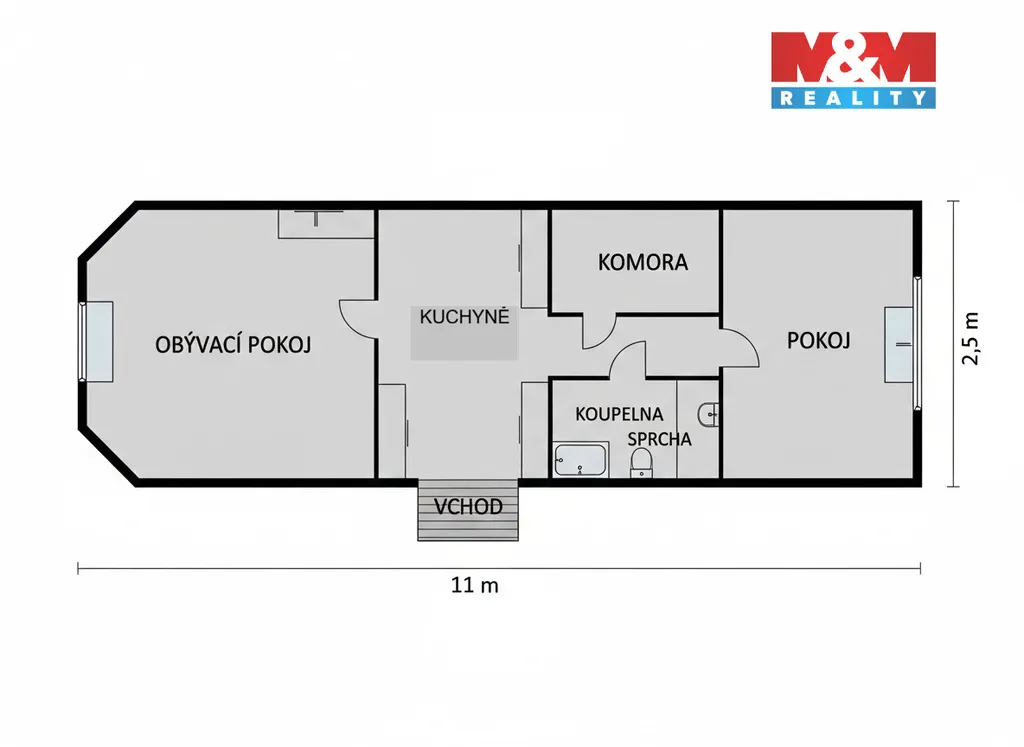 Nabízíme prostorný kompletně vybavený mobilheim s užitnou plochou 42 m2 s jedním vchodem, sedlovou střechou i imitací střešních tašek, dvojitými izolačními okny a dveřmi a zvýšeným stropem v celém domku. Mobilní domek se skládá z prostorného obývacího pokoje, jídelní kout, kuchyně je vybavena linkou, lednicí, myčkou, plynovým sporákem, indukcí. Ložnice obsahuje dvojlůžko a rám na jednolůžko. Koupelna je řešena pevnou zástěnou je v ní sprchový kout, WC, umyvadlo a karma na ohřev vody. Topení je řešeno elektrickými přímotopy a plynovými kamny. Domek je vhodný k celoročnímu bydlení či rekreaci, je k prodeji bez pozemku.