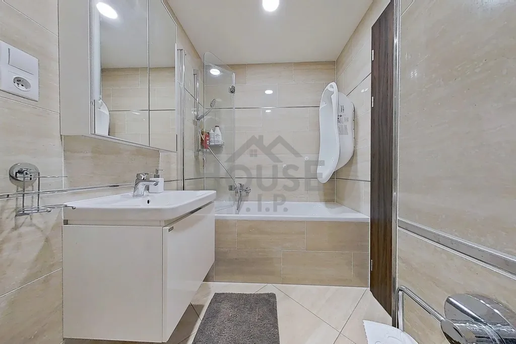 Koupelna je prakticky řešená a vybavená vanou společně s toaletou, prostor je navržen tak, aby poskytoval pohodlí a relaxaci v intimním soukromí vašeho domova, ideální pro klidné a relaxační chvíle po náročném dni, a navíc je vybavena koupelnovým žebříkem, který zajišťuje příjemné teplo a pohodlí.