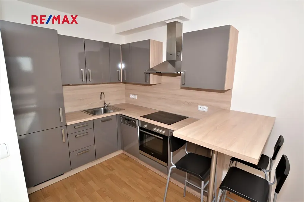 Kuchyňský kout je vybaven moderní kuchyňskou linkou se sklokeramickou varnou deskou, multifunkční el. troubou, myčkou nádobí a lednicí s mrazákem. Pokoj s kuchyňským koutem je průchozí do druhého pokoje. Z obou pokojů je samostatný vstup na terasu. Koupelna je s vanou a toaletou. Úložné prostory nabízí šatna. V ceně nájmu je garážové stání a lze využívat sklep (2 m2). V domě je výtah a je zajištěn úklid společných prostor. Vytápění bytu a ohřev vody zajišťuje vlastní plynový kotel.
