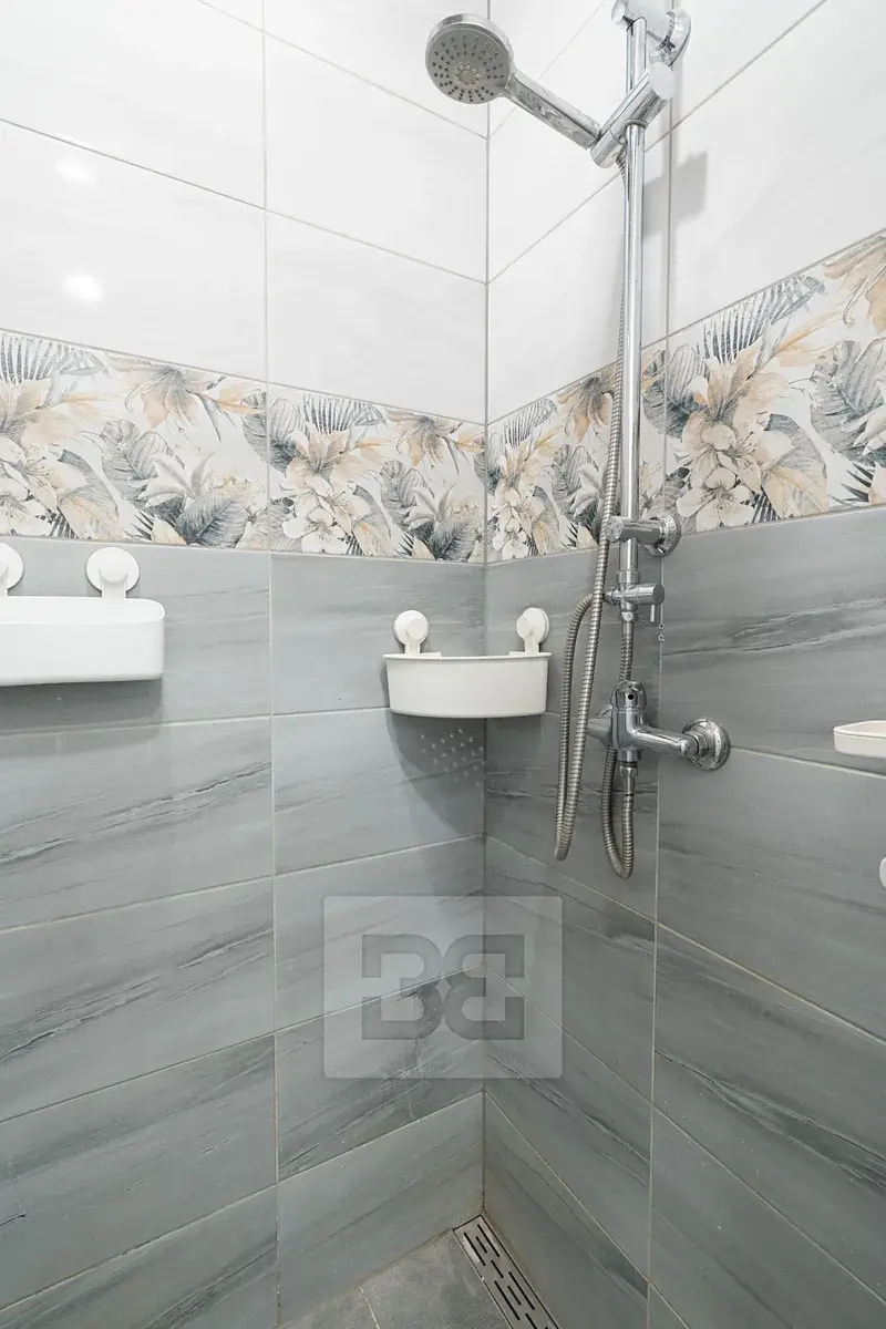 V koupelně se nachází sprchový kout, toaleta, koupelnová skříňka a skříňka pod umyvadlem.
