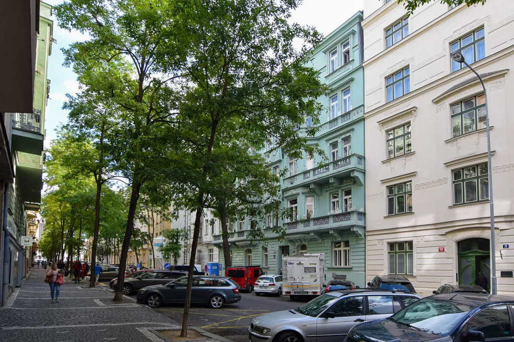 Ulice je klidná, jednosměrná a plná vzrostlých stromů.