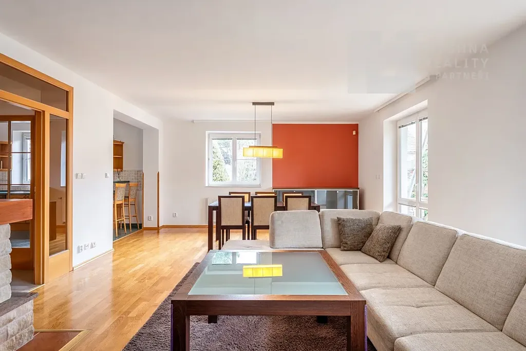Dominantou domu je prostorný obývací pokoj s krbem, který je přirozeným centrem celého domu a navazuje na jídelní část i kuchyni. Interiér působí vzdušně, nadčasově a nabízí možnost dalšího individuálního doladění dle vkusu nového majitele.