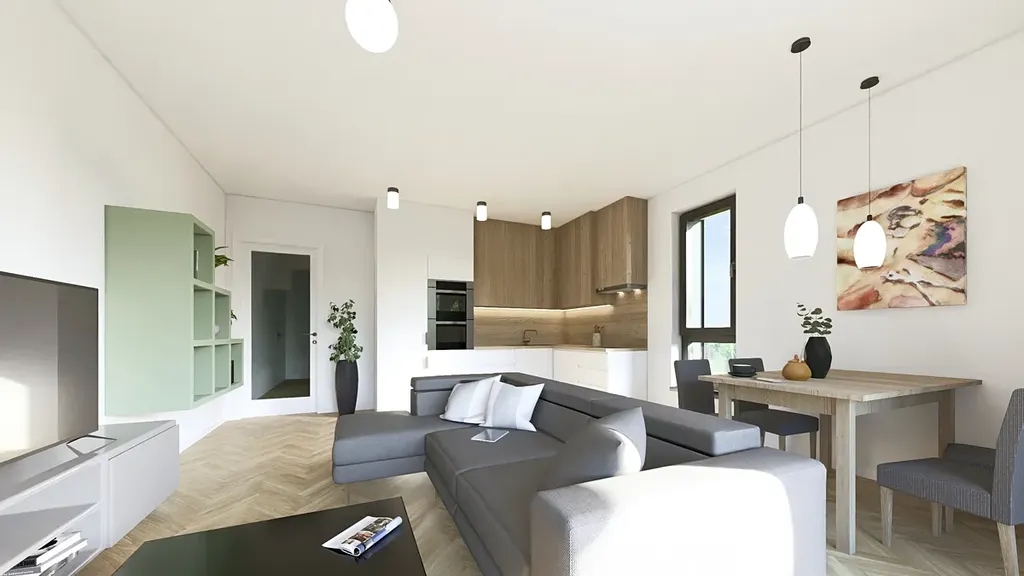 Cena bytové jednotky zahrnuje vysoký volitelný standard (kvalitní vinylové podlahy, zařizovací prvky koupelen Villeroy & Boch, Grohe, velkoformátové obklady a dlažba, plné laminátové CPL dveře a další).