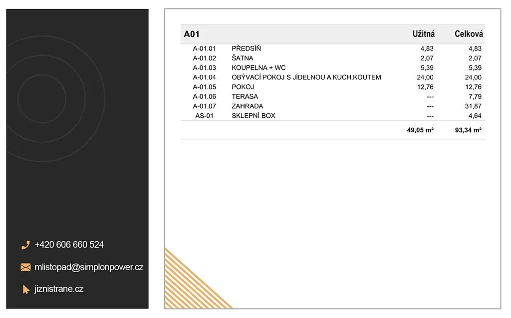 Do této kategorie patří i prezentovaný byt s označením BD4_A01 o dispozici 2+kk s celkovou plochou 93,34 m² (byt 49 m², terasa 7,79 m², zahrada 31,87 m² a sklep 4,64 m²).
