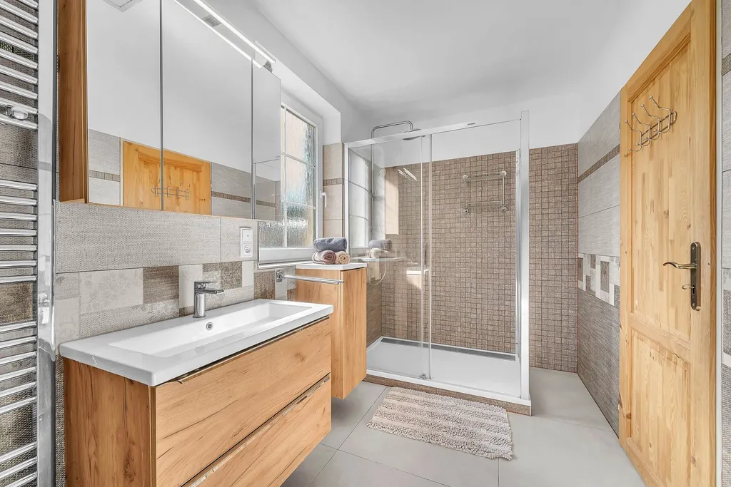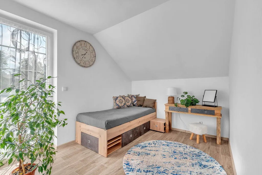 Druhá koupelna s vanou, sprchou a WC, dva dětské pokoje, jeden pokoj pro hosty a prostor na půdě. Dům má dva balkony – vhodné pro ranní kávu nebo večerní odpočinek.