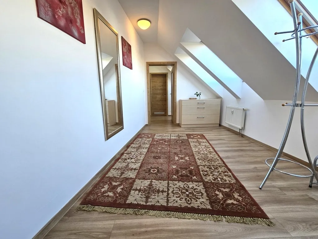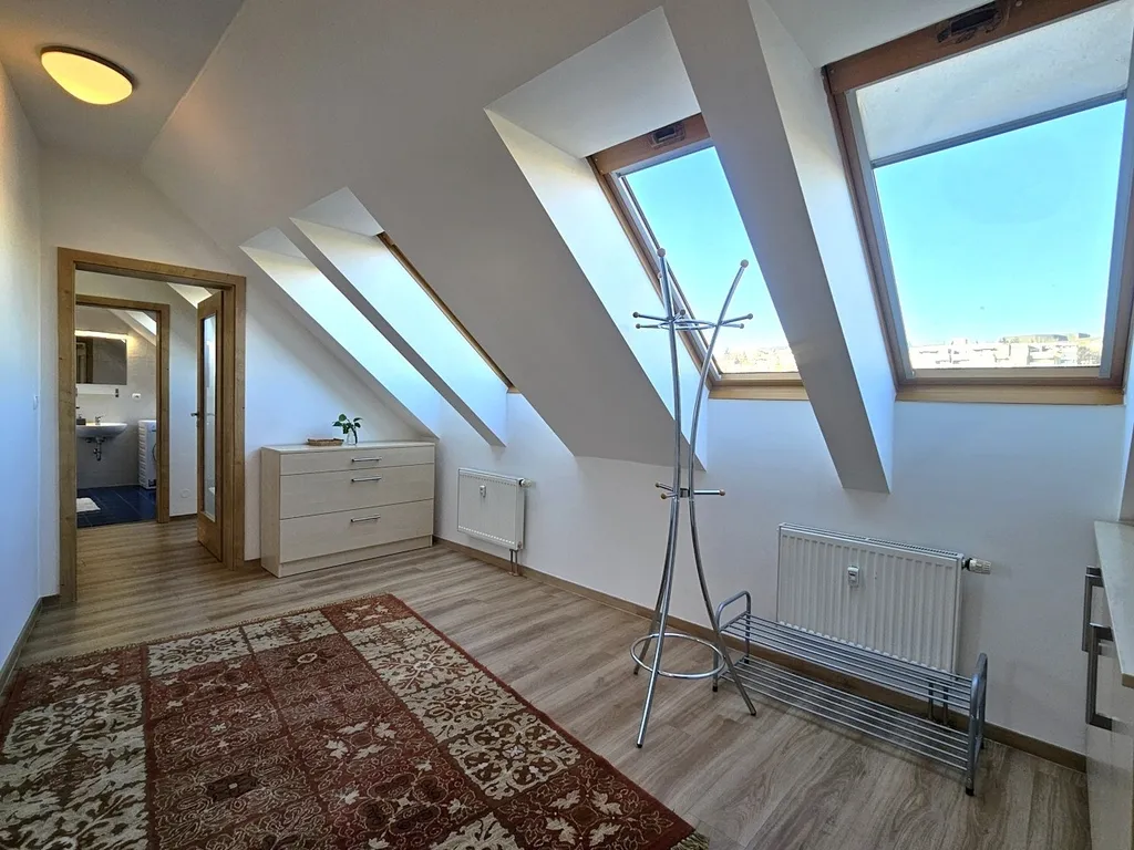 Byt sestává z prostorné vstupní haly, kterou je možné díky 3 střešním oknům využívat např. i jako pracovnu, vnitřní chodby prosvětlené denním světlem, ze které se pak vstupuje do ostatních částí bytu: obývacího pokoje s kuchyní, neprůchozí ložnice, prostorné koupelny se střešním oknem a na WC. Přístup na terasu je z obou pokojů. Byt je po právě dokončené renovaci a je i nově vymalovaný.