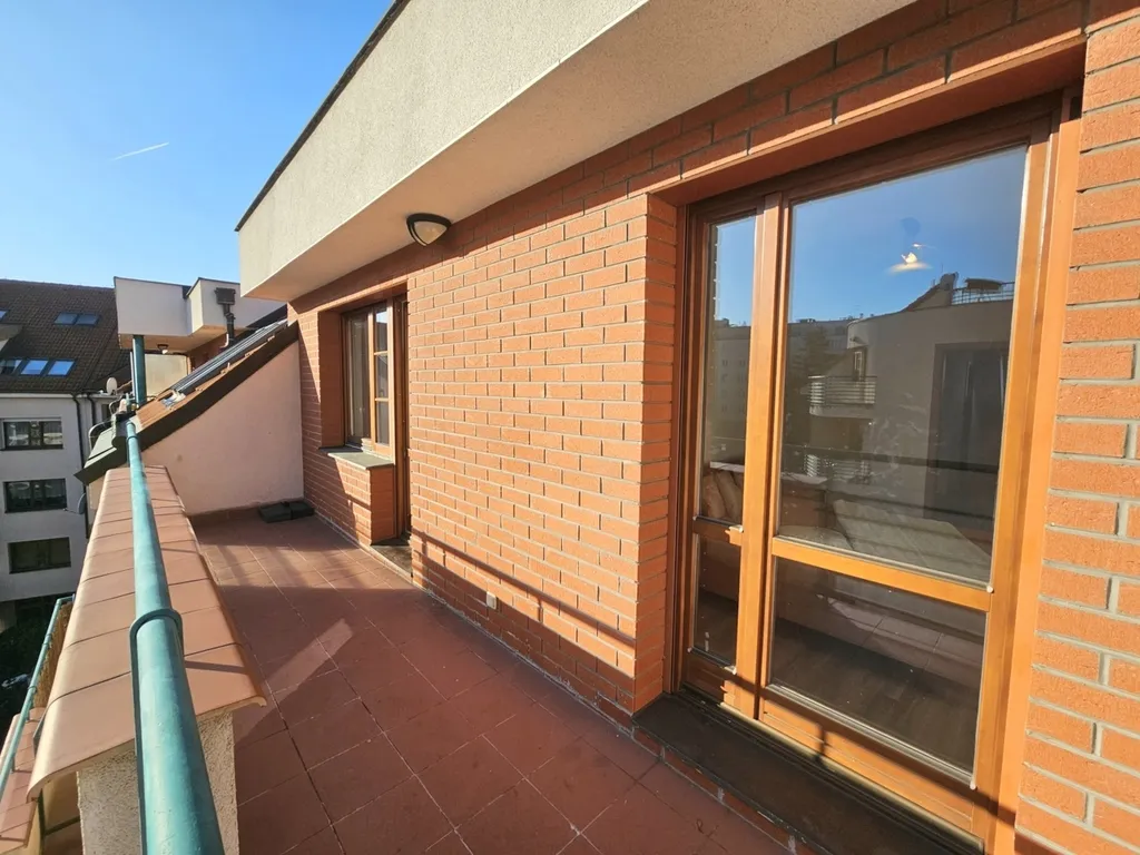 Pronájem bytu - krásný, slunný, tichý byt 2+kk s nadstandardní velikostí 80 m2 + terasa 11 m2 + sklep 3 m2 + možnost pronájmu garážové stání, Praha 6 - Břevnov, ulice Patočkova, 6.NP v cihlovém bytovém domě z r. 2003 s výtahem. Dům má pouze 11 bytových jednotek, ve kterých bydlí výhradně jen slušná klientela, převážně samotní majitelé bytů. Díky tomu panuje v domě příjemná atmosféra a pořádek. Orientace bytu a prostorné terasy o velikosti 11 m2 je na JV s výhledem do velmi klidného, prostorného, zeleného vnitrobloku, který je pravidelně udržovaný zahradníky (2 pokoje a terasa) a na SZ s výhledem do širého okolí Břevnova (vstupní hala, chodba, kuchyně a koupelna). Celý byt je příjemně prosvětlený.