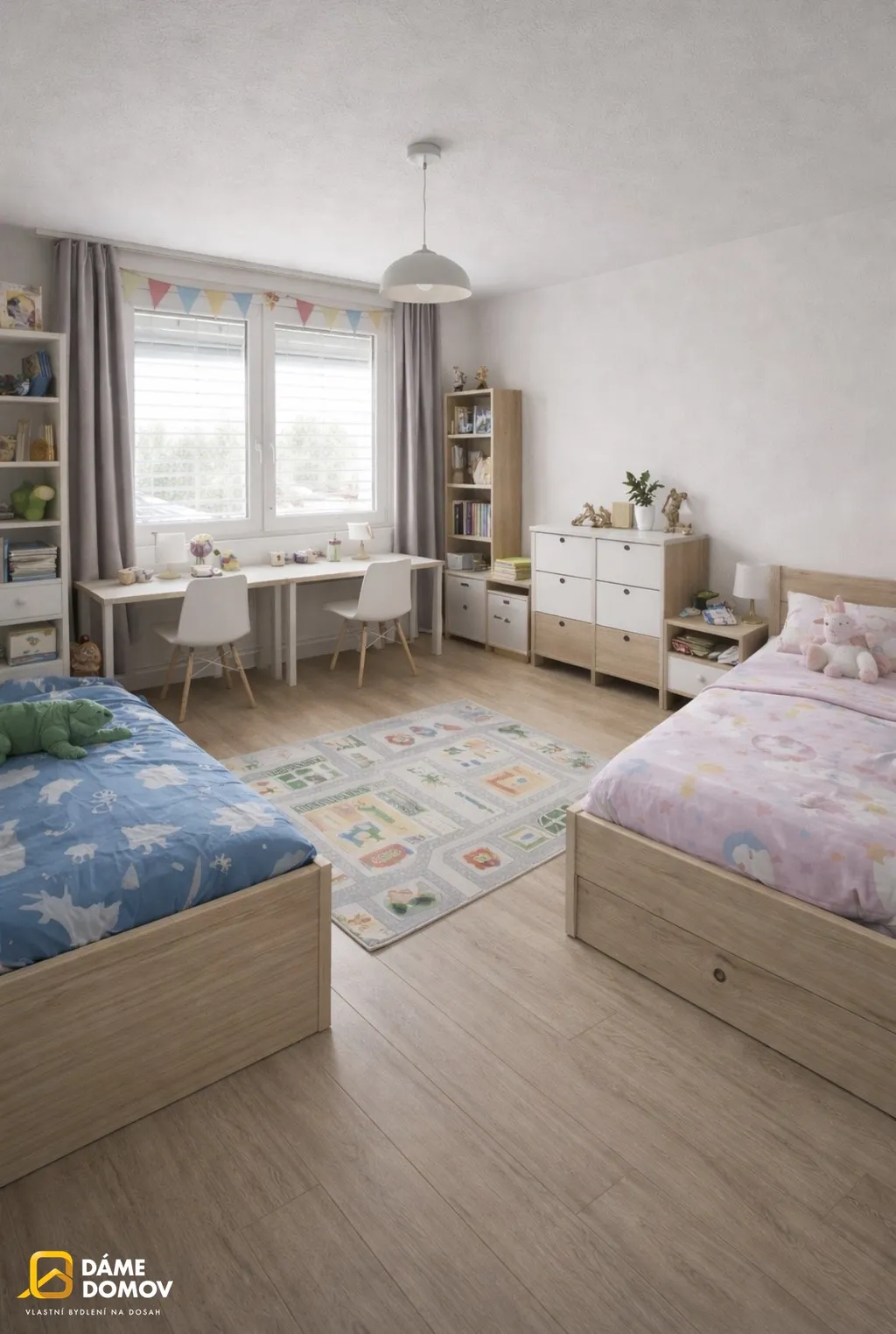 Byt je velmi dobře dispozičně řešený a nabízí minimum nevyužitých ploch. Obývací pokoj je nadstandardně prostorný a bez problémů pojme sedací soupravu, jídelní kout i další nábytek. Stejně tak dětský pokoj je velmi velkorysý, vhodný i pro dvě děti nebo kombinaci spaní a pracovního prostoru. Ložnice je menší, ale i přesto velmi komfortní – umožňuje umístění velké manželské postele i šatních skříní s dostatkem úložného prostoru.
