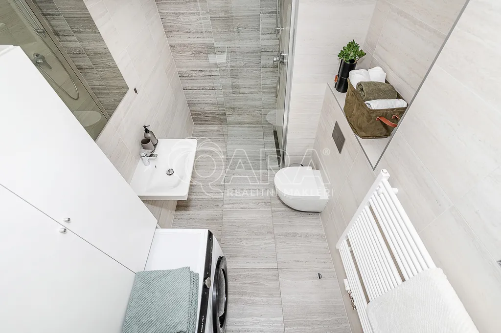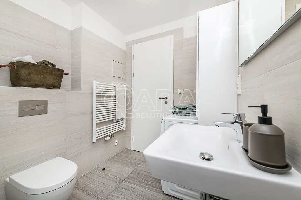 Prostorná koupelna je spojena s toaletou a nabízí walk-in sprchový kout, závěsné WC, místo pro pračku i sušičku a topný žebřík. V bytě je zavedena pozemní TV anténa, rozvody pro internet a vlastní požární senzor.