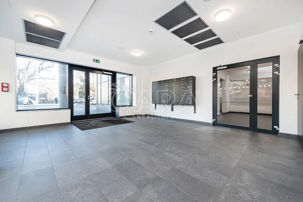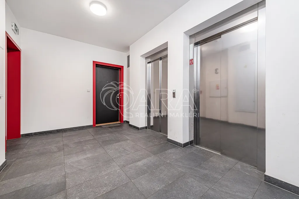 Byt se nachází ve spojovací části dvou věží rezidence, což zajišťuje snadný přístup z výtahu i z parkovacích pater.