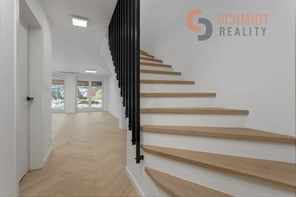 Interiéru dominuje podlaha z dubových parket a schodiště s masivními dubovými nášlapy. Celek tak působí moderně a zároveň nadčasově, což podtrhuje celkový charakter domu.