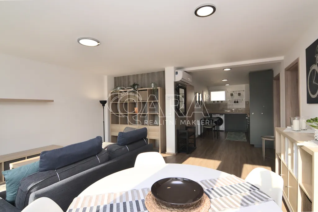 Byt je pro vás připraven zařízený zhruba tak, jak jej vidíte na fotografiích, můžete se tak nastěhovat doslova s taškou. Dominuje mu více než dvacetimetrový obývací pokoj, jehož prosvětlenost zajišťuje jižní orientace oken ve spojení s otevřeným výhledem, obě ložnice pak mají orientaci východní.