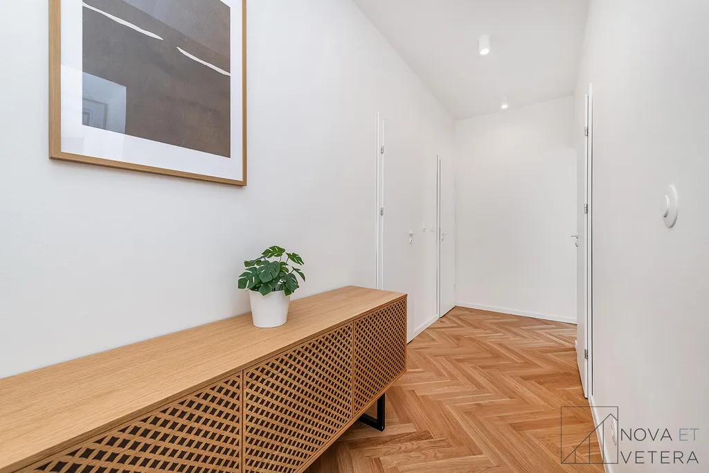 Byt prošel kompletní rekonstrukcí ve vysokém standardu. Součástí jsou nové rozvody elektřiny, vody i odpadů, špaletová okna, bezpečnostní vstupní dveře, dřevěné parketové podlahy a velkoformátové obklady a dlažby od italského výrobce MARAZZI. V koupelně a na toaletě je použita sanita značky GROHE. Moderní kuchyňská linka je vybavena spotřebiči BOSCH (lednice s mrazákem, myčka, trouba, indukční deska), kamennou pracovní deskou a zapuštěným granitovým dřezem.