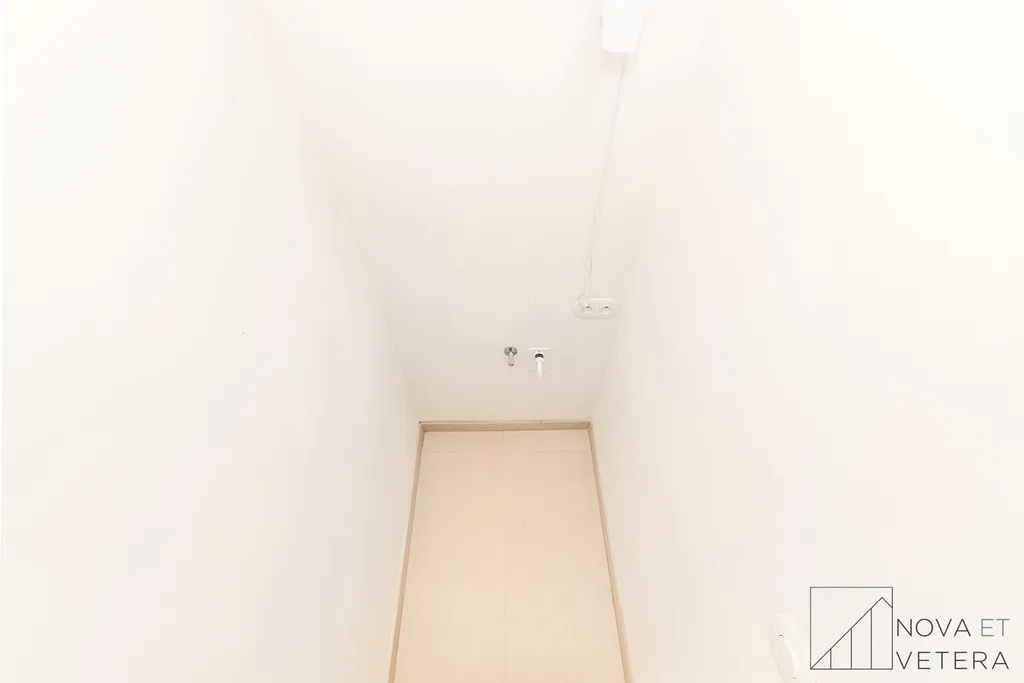 Byt je dispozičně řešen jako 2+kk a nabízí prostorný obývací pokoj s kuchyňským koutem, samostatnou ložnici, koupelnu s průchozím sprchovým koutem a dvěma umyvadly, oddělenou toaletu a praktickou technickou místnost. Součástí bytu je také sklepní kóje v suterénu o velikosti 2,7 m².