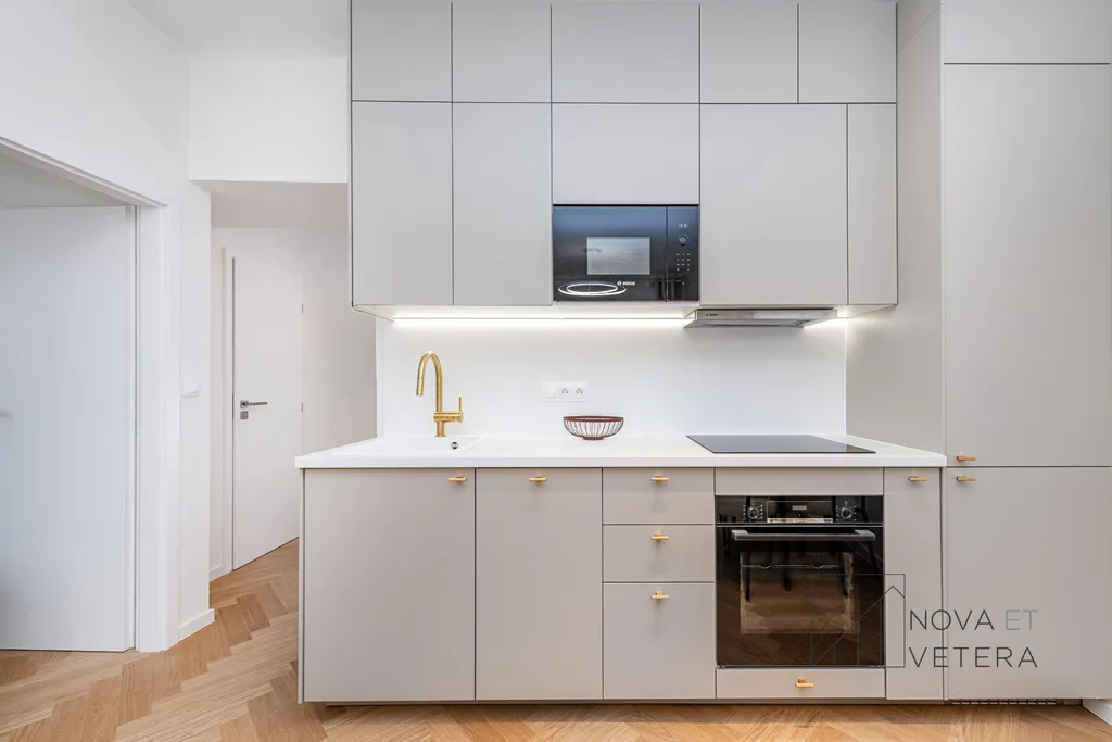 Interiér bytu právě prošel kompletní rekonstrukcí, která zahrnuje nové rozvody elektřiny, vody a odpadu, nové dřevěné podlahy, obklady a dlažby italské značky Marazzi, stejně jako koupelnu a toaletu se sanitou Grohe. Součástí vybavení je moderní kuchyňská linka se spotřebiči prémiové značky Bosch.